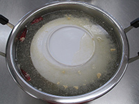⑤浮いてこないように丸平皿をのせ沸騰したら中~弱火にして50~60分ほど煮る。水が減ったら足しながら煮る。