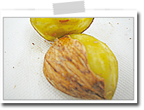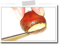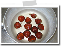 栗の形をまるごと残して皮をむく時は、お湯につけて鬼皮をやわらかくすると、 むきやすく、簡単です |