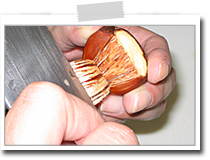 鬼皮(表面の皮)がやわらかくなったら、包丁の手元の角の部分を、栗の切り口に入れ、先の方へ皮をめくるようにしてむく。 |