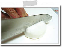 片側の面から崩れない程度まで切込みを十文字に入れる。 隠し包丁であるから、裏側にだけ切り込みを入れる。 |