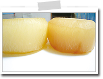 隠し包丁を入れた右の方が、中までしみこんでいる。 |