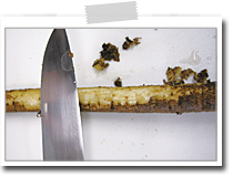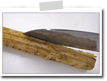包丁の背を斜めにあてて皮をこそげ取る。皮目に香りやうまみが集中しているので、なるべく薄く皮を除くようにする。 |