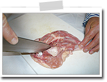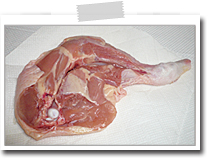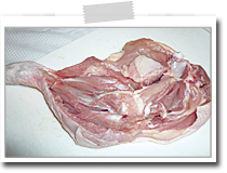 足の付け根の骨に沿って左右に包丁をいれ、開く。