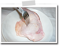 鶏肉の皮にフォークで穴を開けておくと火の通りがよくなり、味がしみやすくなる。