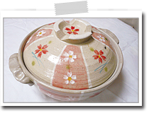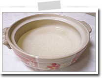 お米は洗ってからザルに上げて水気を切り、大きめの土鍋に水7カップとともに入れて、30分以上浸しておく。 |