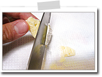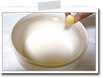 | フォンデュ鍋の内側にニンニクの切り口をこすりつけて香りをつける。 |