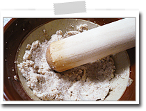 すり鉢で白ごまをすりつぶし、焼いてほぐしたアジを加えて、更によくすりつぶす。 |