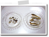 頭とわたから苦みが出るので取りましょう。 さくことで、うま味が十分出てきます。 |