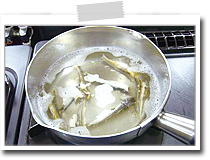 鍋に分量の水と煮干しを入れ、10分くらいおく。 |