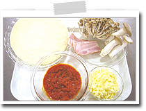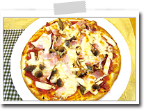 ピザ生地にピザソースをぬり、しめじ、エリンギ、ベーコンをのせ、ピザ用チーズを散らし、230℃のオーブンで約8分焼く。 |