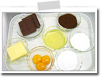 温度が高いとチョコレートの風味が落ちてしまいます。バターがきちんと溶ける前に次の手順に進むと、焼き上がった時にケーキに穴が開いてしまいますので、焦らずゆっくり溶かしてください。水けが入らないよう注意してください。 |
