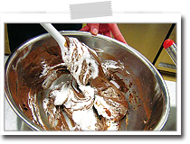 この最初の1/4のメレンゲは、チョコレートとメレンゲをなじませるためなので、メレンゲがつぶれても気にせずしっかり混ぜてください。 |