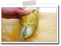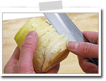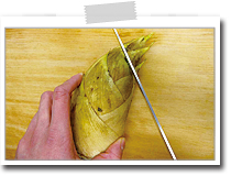 たけのこの身を傷つけないように、たてに1ヶ所包丁を入れる。 |