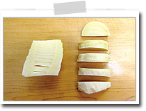たけのこはたて半分に切る。1cmの幅で繊維に対して直角に包丁を入れ、半月切りにする。 |