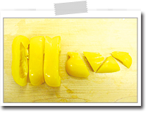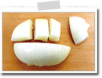 玉葱は半分に切り、さらに2cmの幅に切る。 パプリカは種を除き、縦に2cmくらいの幅に切ってから、乱切りにする。 |