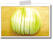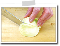 玉ねぎをたて半分に切り、切り口をまな板につけて置き、根元の部分を切り離さないように繊維に沿って包丁で細かく切り込みを入れる。 |