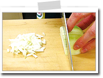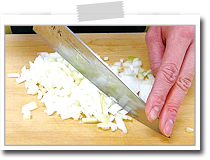 さらに包丁の先をまな板につけ、包丁の柄を上下させ、玉葱をみじん切りにする。 |