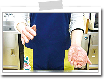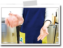 両手のひらを30cmくらい離して向かい合わせ、片手に持ったハンバーグをもう片方の手のひらに軽く投げつけるようにします。