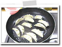 フライパンにサラダ油を入れて強火で熱し、 ぎょうざを並べて1分焼く。 |