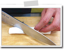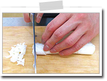 長ねぎの半分の深さまで切り落とさないよう気を付けて斜めに細かく包丁で切込みを入れます。裏返して同じように切り込みを入れた後、端から細かく切っていくとみじん切りになります。 |