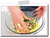 | 大葉5枚分をせん切りにし、一度水にさらして水けをしぼったものを基本の材料に加えて作るとさっぱりといただけます。 |