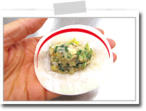 たねを24等分にし、ぎょうざの皮で包む。 |