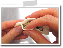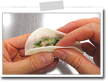 中央に具をのせて、 皮の内側の半分に水をつける。 |