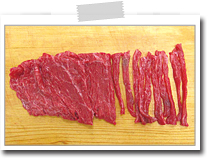 牛肉をよく見て、繊維の方向を確認して切ってください。繊維に直角に切ると、炒めた時にぼろぼろになってしまいます。 |