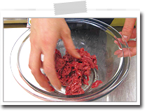 サラダ油を加えるのは、炒めた時に肉をほぐしやすくするためです。先にサラダ油を加えると、牛肉に膜を作ってしまい、調味料が染み込みにくくなるので後から加えます。 |