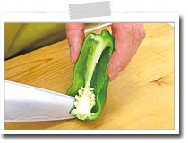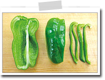 ピーマンを縦半分に切り、へたと種を除く。縦の方向にせん切りにする。 |