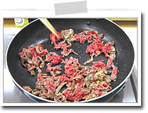 残りのサラダ油大さじ1とにんにくのみじん切りを入れる。再点火して中火にし、下味をつけた牛肉を入れてほぐすように炒める。 |
