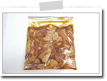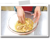 ボウルに鶏肉と調味料を加えて味をなじませてもよいですが、ビニール袋に入れて漬け込むと、全体に調味料がまわりやすいので、少量の調味料ですみます。 |