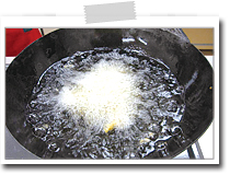 170℃(衣を油に入れた時、中ほどまで沈んですぐに浮き上がる温度)にあたたまったら中火にし、衣をつけた鶏肉をひとつずつそっと入れる。 |
