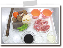 鍋に油を入れて中火にかける。あたたまったら鶏肉を入れ、表面の色が変わるまで焼く。鶏肉を一度取り出し、にんじん、しいたけ、水けをきったごぼう、れんこん、里芋、こんにゃくを加えて全体に油がまわるまで炒める。 |