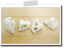 れんこんは皮をむいたあと、空気に触れると変色しやすいので、切ったらすぐに酢水につけます。 |