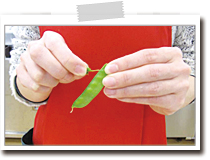 絹さやは筋をとり、ラップで包み、500Wの電子レンジで30秒加熱してザルに広げ、冷ます。斜め半分に切っておく。 |