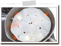 落としぶたは鍋の直径より一回り小さいものを使ってください。木製やプラスティック製のものがありますが、アルミ箔やクッキングシートでも代用できます。煮立った汁が落としぶたに当たって落ちるので、煮汁の量が少なくても素材全体に行きわたります。 |