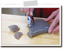 急ぐ場合は、こんにゃくをスプーンや手でちぎってもよいです。包丁で切るよりも味がしみ込みやすくなりますので、普段のお惣菜用にはこの方法でよいでしょう。 |