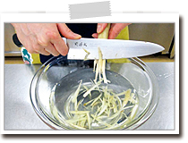 酢水を入れたボウルの上でごぼうをささがき切りにし、切ったものが酢水に落ちるようにします。