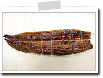 うなぎの蒲焼きは幅を半分に切り、 3cmくらいの長さに切る。 |