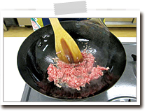 挽肉はほぐすように炒めましょう。ここでしっかり炒めると、挽肉の臭みを感じにくくなります。 |