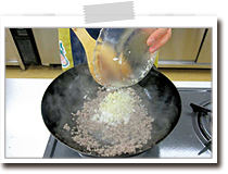 挽肉の色が変わったら、火加減を中火に変えてAのみじん切りを加えて炒める。 |
