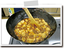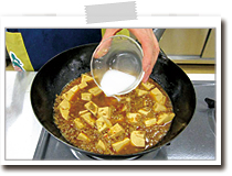 ここで味見をし、辛さを確認してください。もう少し加えても大丈夫であれば、小さい容器に煮汁を大さじ1くらい取り出し、追加する豆板醤を溶き、鍋に戻します。 |