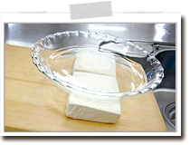 木綿豆腐はキッチンペーパーで包んでまな板に置き、豆腐の上に皿をのせてそのまま15~20分おき、水をきる。 |