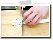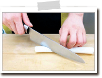長ねぎの半分くらいの深さまで、切り離さないように気をつけながら、斜めに2~3mmの間隔で切り込みを入れます。裏も同様に切り込みを入れます。両面に切り込みを入れたら、端から細かく切っていくとみじん切りになります。 |