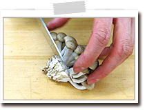 しめじは石づきを切り落とし、ほぐす(太いものは縦半分に裂き、長いものは長さを半分に切る)。 |