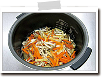 飾り用の三つ葉以外の具材(2~6)をすべて米の上にのせ、炊飯器のスイッチを入れて普通に炊く。 |