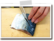 さばは水けをキッチンペーパーで拭き、皮に切り込みを入れる。 |