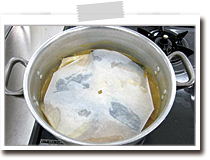 落し蓋は煮汁が少ない煮物の場合に使いますが、沸き上がった煮汁が落とし蓋に当たって素材全体に行き渡るので、少量の煮汁でもしっかり味がしみ込みます。 |