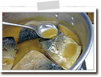 途中で数回、スプーン(又はお玉)を使って煮汁をさばにかけると、より一層味のしみ込みと火の通りが良くなります。落とし蓋を一度外し、1切れに対して煮汁を4~5回かけたら再び落とし蓋をのせて煮ます。これを時間をおいて数回繰り返すと良いでしょう。 |